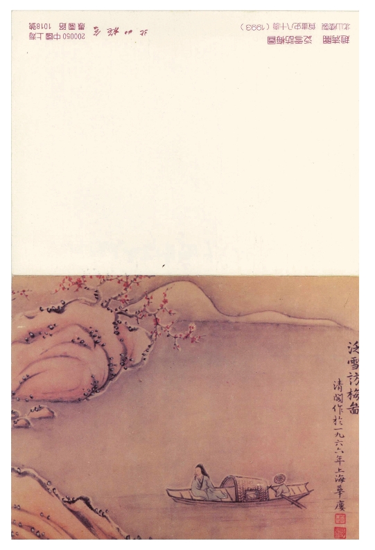 伯伯的家距赵清阁孃孃的住处很近,因此得以和赵孃孃来往几次。我小的时候赵孃孃住在重庆北碚,我住在北碚江对面的黄桷树,北碚是个小文化中心,逢年过节爸爸带着全家到北碚与老舍、何廼仁等老友聚会,我就住在赵孃孃的宿舍里,和她很熟悉。这次见面,孃孃赠我一幅泛雪访梅图(1966年画)。我到中国图片社复制了一张寄给她以留念。以后被施蜇存老先生看见,大呼可惜,“不该送给她呀!”他遂拿去香港,制成当年的贺卡。此画又被多位学者转载,附在他们的研究作品里。