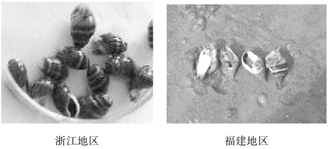 (1)麻痹性贝类中毒:发病急,潜伏期数分钟至数小时不等,毒素主要作用麻痹人的神经系统,初起为唇、舌、指尖麻木,随后腿、颈麻木,运动失调,伴有发音困难、流涎、头痛、呕吐,最后出现呼吸困难,患者意识清楚。严重者因呼吸肌麻痹而死亡。死亡通常发生在中毒后2~12小时内,患者如24小时后仍存活,一般预后良好。我国南方沿海已有多起这种中毒病例的报告,主要是织纹螺(图7-1)。
