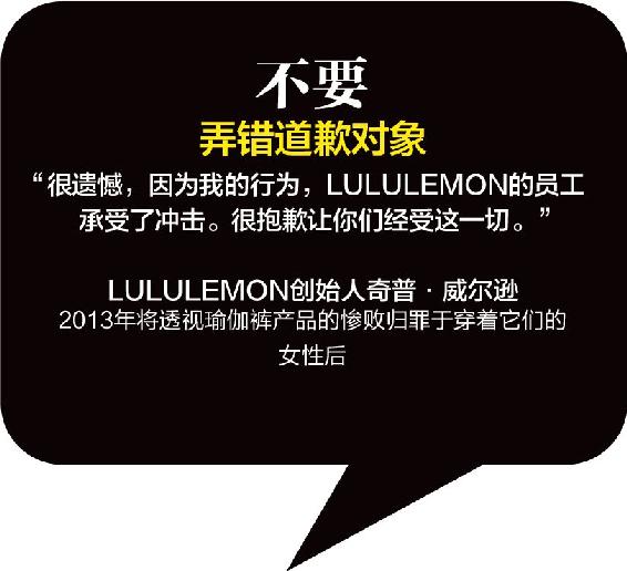 确定道歉的对象通常很容易,但也有企业犯糊涂。Lululemon创始人奇普·威尔逊(Chip Wilson)在一次采访中声言本品牌的瑜伽裤不适合某些体型,引发强烈负面反应。他在随后发布的视频中所说“很抱歉让你们经受这一切”,是对自己员工而不是消费者说的,遭到广泛批评。有效的道歉要明确指向受害方。如果受害群体规模大、较为分散,企业应通过媒体或网络公开道歉。