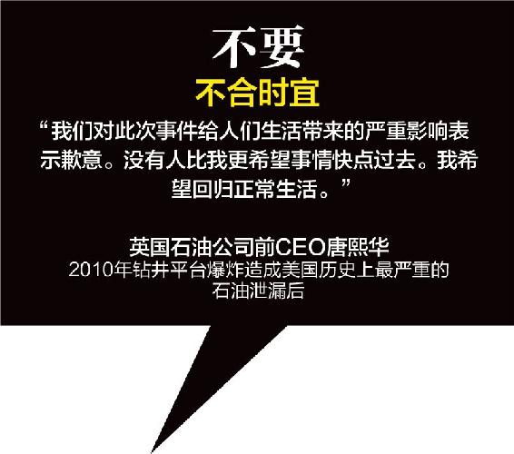 没有掌握好表达方式的一个突出例子是曾任英国石油公司CEO的唐熙华(Tony Hayward),2010年灾难性的墨西哥湾漏油事件后,他发表了如下道歉声明:“我们对此次事件给人们生活带来的严重影响表示歉意。没有人比我更希望事情快点过去。我希望回归正常生活。”这番话极不合时宜,显示出即兴道歉声明的巨大风险。(唐熙华数周后辞职。)