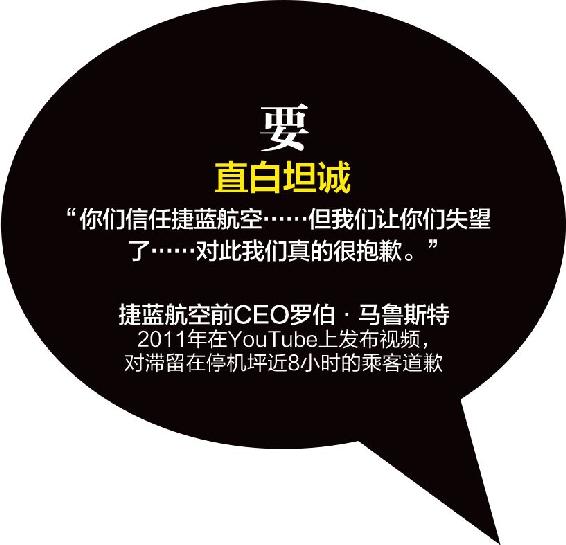 例如,塔吉特被曝信息库遭侵入的次日,当时的CEO葛莱格·斯坦哈费尔(Gregg Steinhafel)即发表道歉声明。捷蓝航空一架满载乘客的班机在跑道上滞留8小时,当时的COO罗伯·马鲁斯特(Rob