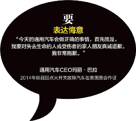 Barra)的道歉声明获得好评:“现在的通用汽车将做正确的事情……我深表歉意。”巴拉还告诉员工,这个错误“不可接受”;15名对掩盖缺陷负有责任的管理者被解职。前任CEO决定不为错误道歉,但如果新任CEO认为有必要道歉,无论过去多长时间,企业也应道歉。