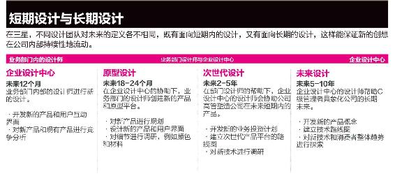 商业上的成功提升了设计师的话语权,前卫设计的价值被公司广为接受,因此三星在超前性设计项目中投入了大量资金。实际上,三星目前有四种不同周期和时间线的设计项目(见图表“短期设计与长期设计”)。