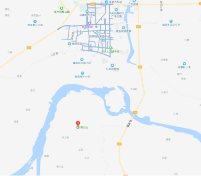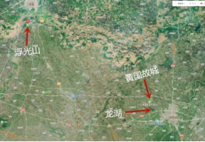 卫星地图显示的浮光山与黄国故城、故城南边的龙湖位置图