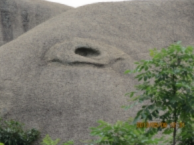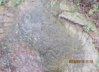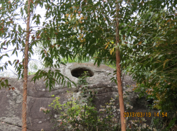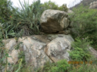 位于溪内村田厝自然村东南胶东坑“石膣巷”北口,距田厝村约3公里大石头顶上。在宽约15厘米、高约40厘米的椭圆石穴四周,凿刻直径约55厘米的圆圈,圆圈中间隆起约5厘米。圆圈下方有一条与圆圈等宽的浅凿槽直达大石的底部,圆圈左边凿刻一条3厘米可小沟通左下方另一个石穴。