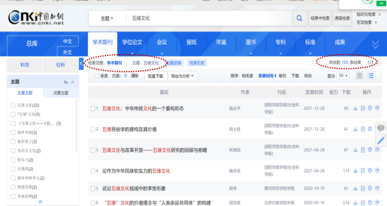 书籍和期刊是科学研究成果的重要呈现方式。相较于书籍来说,期刊具有“更新速度快”“覆盖面广”“内容新颖”优势,因此影响力更广。故本研究主要聚焦于“五缘文化”的期刊文献。而在国内的三大数据库中,中国知网(CNKI)被公认为是最权威的数据库[]。据此,本研究以“中国知网学术期刊出版总库”为数据源,在数据获取方面,以学术期刊为范围,五缘文化为主题,作为检索条件,选择自定义关键词,不设时间年限,不限学科。经检索后共得到103篇期刊文献(图1)。本研究再将所得的期刊文献转为EXCEL文档后,进行数据清洗,得到共计426个关键词,并以此作为后续分析研究的基础(检索时间为2022年4月11日)。