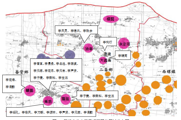 说 明:红色标示李姓聚居地;黄色标示廖姓聚居地;紫色标示钟姓聚居地。