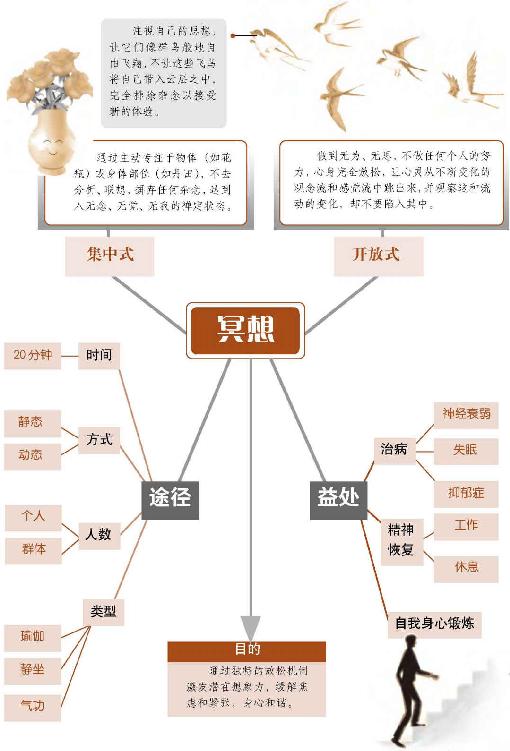 冥想就是一种放松训练法,即按照一定的练习过程控制或调节自身注意力及心理活动,调整因紧张刺激而紊乱的生理功能,从而缓解精神焦虑、减少压抑的方法。关于冥想的研究表明,冥想者由于都有长时间调息的训练,他们的呼吸会变得更深、更缓慢,也更容易集中精力解决眼前的问题,且记忆力、理解力、感知力都会明显超过没有进行过冥想的人,这充分显示冥想之后机体深层放松和唤醒自我意识的好处。实验也证明,冥想的生理状态与通过其他放松机制如催眠、生物反馈及深度肌肉放松等所引起的生理状态是一样的。