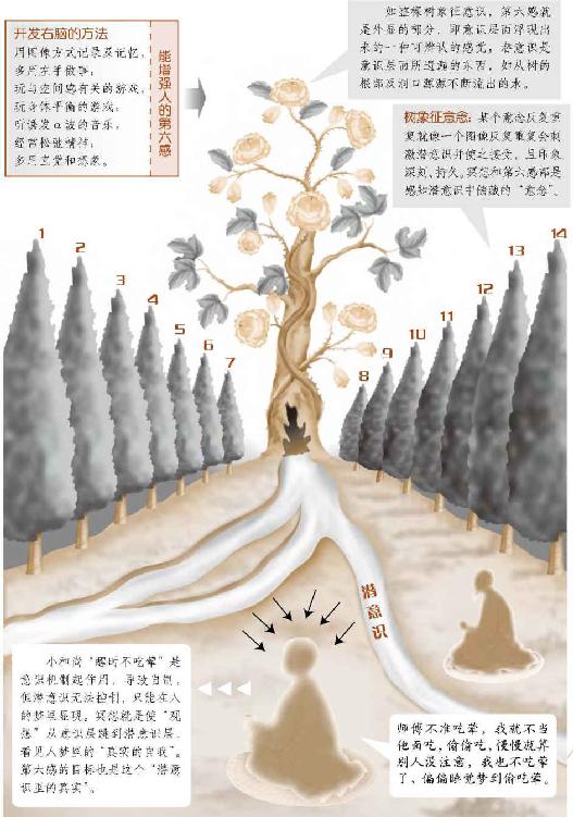 (2)想象化机。右脑懂得透过天马行空的创造力,将种种意义重组,感应出整全的信息(这是作家、作曲家、画家的灵感诞生的原理)。