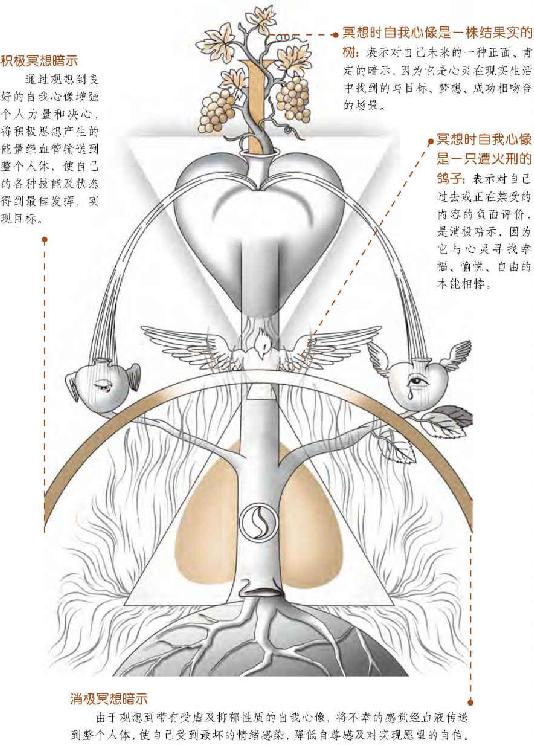 自我心像属于接受自己本真面目和需要的暗示,观想暗示就是把自己提升到更高级意识或心灵、更高层觉悟或能量的暗示法。它们都能改变脆弱的自我意识的面貌,而使自己的内在意识变得积极、强大和有目的性。