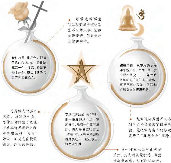 无论是原始、野蛮的巫术迷信的医疗手段,还是带有现代心理学色彩的精神治疗,都产生过很多神奇般治愈的案例,以致从古至今都会有人相信神秘治疗术的存在。东西方运用与冥想有关的神秘术进行治疗的例子介绍如下: