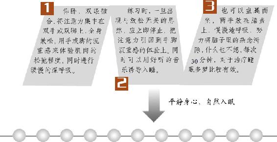 (2)临睡时不要再接着思考白天的问题或回忆易激起情绪反应的事。放松地仰卧在床上,闭上眼睛,头下放一个薄枕头,双手轻轻搁在肚脐上。注意力集中于自己的呼吸,进入冥想的状态。