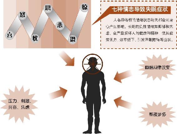 失眠是指持续出现了不能入寐的睡眠障碍,或睡眠时间和质量不足,以致影响白天正常工作、作息规律的一种症状。其主要表现为难以入睡,上床后仍辗转反侧,头脑兴奋;浅睡易醒,稍有声响或震动就从睡眠状态中醒觉;经常早醒,无论睡得早晚,总是未到天亮就醒过来;夜晚多梦,第二天白天感到精神不振、精力不足。失眠与外部刺激、生活作息及心理紊乱、睡前精神活动兴奋有关。