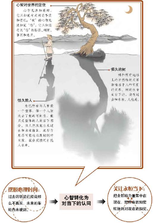 关键是人能促进心智的成熟,却不能完全撤离心智,否则就无异于疯人病院的常住病户,或者思维长眠不醒的植物人。心智和人自身的联系紧密,在人没有达到完全的开悟前,是无法超越心智的。现实的人通过冥想达到的最高阶段的开悟也只是心智的成熟。走出心智认同的局限的最重要的一点是:终止时间的幻相,活在当下的生命中。