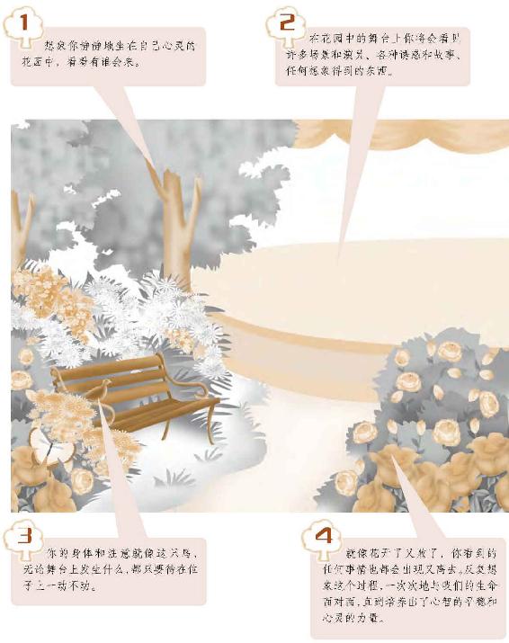 冥想并不是我们想象的、为你的心灵写下了最好的“剧本”,当你看毕这个“剧本”,智慧和了悟就会来临,而是一个不断重复的精神训练,你可能需要很多次类似下面场景的观想,才能从你自己的心灵花园中清醒过来。