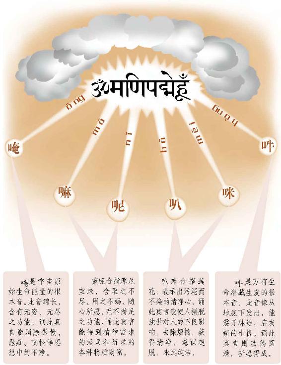 藏密语音冥想一般是在禅定时口诵咒语,它们是一些神圣声音或听觉符号,能唤起内心深沉的情感及潜在的力量,如六字大明咒(下图中间字符即为此咒的梵文书写),也常用于祈祷。