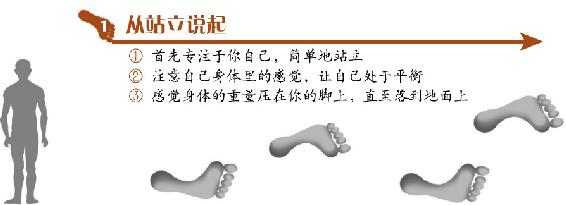 传统意义上的冥想都伴随着坐姿,但如果你无法保持静止,也可以采取步行冥想的方式,慢慢地走,把注意力集中到你的脚接触地面的感觉上,并凝视面前散落的足印。