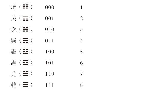 德国著名的哲学家、数学家莱布尼茨(1646-1716)发现《周易》由阴爻、阳爻两个符号构成六十四卦,运用的是二进制数学。在二进制数学中,只有两个符号0(阴爻)和1(阳爻),用这两个符号可以写出一切数字。如: