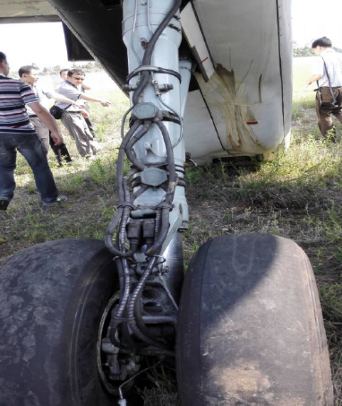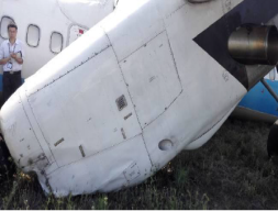 飞机整个机翼水平面向前倾斜约20 度,机翼后部脱离机身上翘,发动机前部下垂触地,机身中部折断但未完全断开。左、右螺旋桨桨叶全部打断,左、右桨毂罩均脱落在接地点附近约50 米处,前后有两片较大块桨叶。右发一片桨叶插入右机身下部。所有起落架未折断、轮胎未爆破。飞机严重受损。