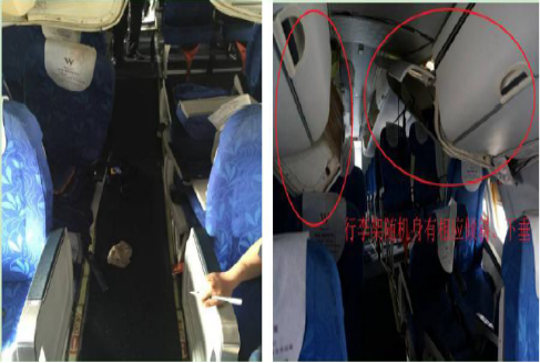 过道4 排-7 排因龙骨断,出现30 度左右坡度,行李架随机身有相应倾斜下垂。(见图14)