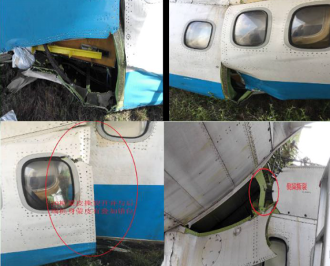 事故造成航空器严重受损,整个机翼水平面向前倾斜约20度,机翼后部脱离机身上翘,发动机前部下垂擦地,机身中部折断但未完全断开。左、右发螺旋桨桨叶全部打断,左、右桨毂罩均脱落在接地点约50 米处,前后有两片较大块桨叶。右发一片桨叶插入右机身下部。所有起落架未发生折断、轮胎未发生爆破。具体受损情况如下: