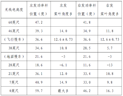 飞行机组在高度28英尺将左右发功率杆收至18.6度和11.6度,均低于地面慢车对应的功率杆位置,根据该图表(见表2)推算,左右发桨叶角分别为-6.1度和-13度,螺旋桨均处于反桨位置,右发螺旋桨接近全反桨位置(-15.2±1.7度)(见表4)。随后至接地的3秒时间内,飞行机组在高度21英尺将左右发功率杆前推至36.1度和33.4度,均低于飞行慢车位。在高度7英尺将左右发功率杆设置为40.9度和33.0度,在接地瞬间将左右发功率杆前推至59.7度和46.2度,发动机无法及时响应并提供足够的正拉力,飞机加速下沉直至接地。在接地瞬间,主液压系统压力因撞击瞬时由2171PSI下降至175PSI,飞机失去方向控制,因惯性向右偏出跑道直至全停。