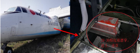 右侧机身12 框中部蒙皮约5 点方向(顺航向)有一个约2厘米X2 厘米贯穿孔;右侧机身11-12 框3 窗玻璃破裂;右侧12-13框(4 窗)下部蒙皮约5 点钟方向(顺航向)有一桨叶插入机身,损伤尺寸约为60 厘米X32 厘米,桨叶外露长度约83 厘米;右侧21-22 框(应急窗口后第6 窗)处约3 点方向(顺航向)有一个约50 厘米X80 厘米凹坑,蒙皮有起皱现象;右应急窗框变形,左应急窗框有轻微变形;左侧11 框(2 窗-3 窗)中部蒙皮约8点方向(顺航向)有一个约2 厘米X3 厘米贯穿孔。底部11 框-40框接地,29-30 框底部磨穿(见图8)。