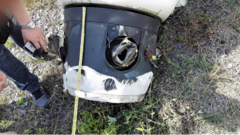 左发桨帽大部分丢失,剩余桨帽径向长度约10 厘米;进气道接地变形,螺旋桨变距机构端头至进气道接地长230 厘米,宽80 厘米,4 根桨叶全部丢失,仅可见桨根复合材料切口,打开发动机包皮,目视检查发动机吊点正常在位,发动机内部结构部件完好(见图10)。
