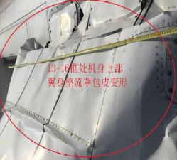 机身右侧在17 框处上下错位,后部比前部高约40 厘米,17框处蒙皮中部左右错位,后端比前段突出约15 厘米(见图6)。