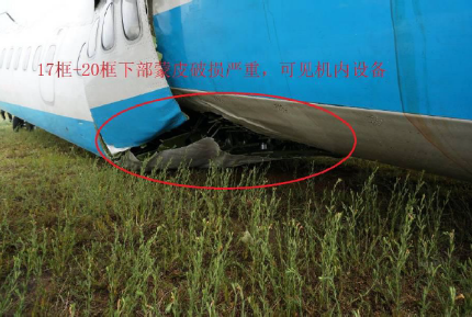 飞机从17 框到20 框机体龙骨断裂, 17 框-20 框下部蒙皮破损损严重,可见机内设备(见图7)。