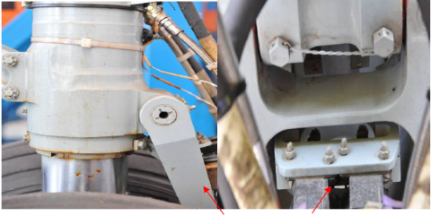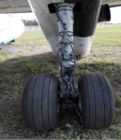右主起落架外观良好,刹车管路检查无异常无渗漏:减震支柱停机压缩量约为350 毫米(因起落架倾斜未完全受力,正常压缩量为85-110 毫米)。右内主轮红色标记无错位,胎面未见帘线,刹车指示杆长度正常,胎压约560KPA(正常胎压为542-592 KPA);主轮轮毂内侧外缘有缺失;右外主轮红色标记无错位,胎面未见帘线,刹车指示杆长度正常,胎压无压力,胎面中部有两处铁片扎伤,主轮轮毂内侧有擦伤痕迹(见图12)。