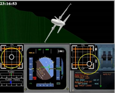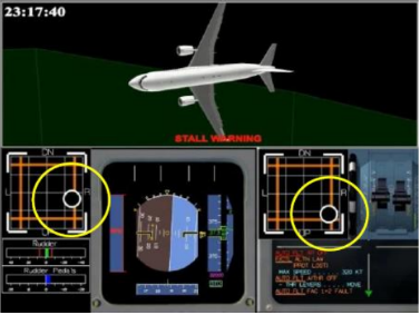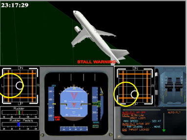 自动驾驶脱开9秒后右座开始操纵驾驶杆,修正飞机左坡度并向后带杆至15.1度。使飞机坡度变成向左9度,但俯仰角远大于所需角度,之后又向左操作侧杆导致飞机回到左坡度50度。副驾驶操纵飞机30秒后,机长侧杆开始有输入,先是低头指令,然后多是在中立位,从此时至事故发生,副驾驶在这一阶段一直在向后拉杆,一度触发了双侧杆输入,左侧杆的低头(向前)俯仰指令被抵消。