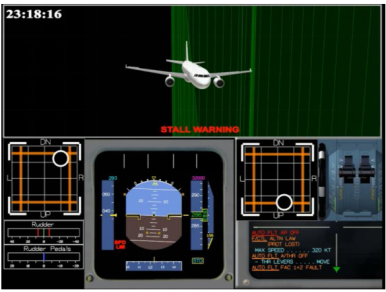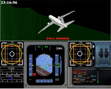 在重置FAC1跳开关后,机长又起身去重置FAC2跳开关。因此,当FAC1断电17秒后,FAC2也出现了断电,导致第6次主警戒信息出现,ECAM显示“AUTOFLTFAC1+2FAULT”的故障信息。结果是自动驾驶和自动油门脱开,飞行控制由正常法则转变为备用法则,方向舵向左偏转2°,使得飞机以6°/秒的速率向左侧滚转。这是由于两个FAC都脱开时,方向舵运动不能自动补偿的结果。自动驾驶脱开后,飞行员不得不采用手动驾驶,但是在9秒钟之内,飞行员没有采用侧杆来阻止飞机的滚转,使得飞机向左滚转坡度达到54°,飞机出现非指令滚转。自动驾驶脱开后不到1秒时间内,失速警告响起1秒,停了1秒,之后继续响起直至最后。