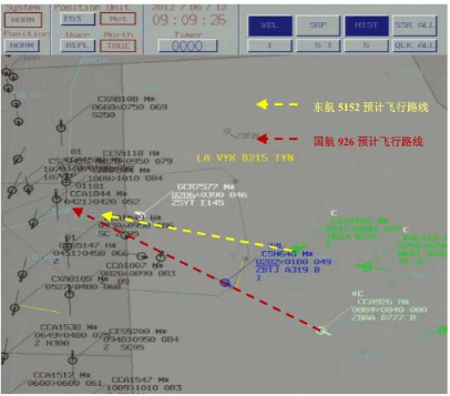 17:09:26,管制员在呼叫国航926未果后,指挥飞行高度为8400 米的东航5152航班右转航向300度并上升高度9200米进行避让。根据管制雷达图显示,国航926正在通过8840米继续下降到8400米,当时两机相距约40海里,呈约20度锐角汇聚飞行。如图所示: