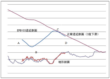QAR译码提供了A点至D点的数据。A-D的蓝色曲线为EPB103航班进近剖面示意图。最上面的红色曲线为正常进近航班的QAR译码轨迹。最下面的曲线为地形曲线(计算数据),其中较短的一条为事发EPB103 航班数据,较长的为另一正常进近航班的数据译码。