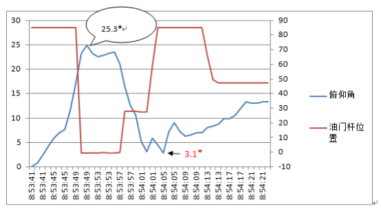 3、机组处置不当。机长在使用TO/GA推力起飞时没有意识到飞机处于小重量、大推力状态,在无V1指示时对即将出现的起飞无SRS指引状况没有心理准备,在抬头阶段发现无SRS指引时,没有按照手册双发起飞典型姿态要求将仰角控制在15度,致使起飞仰角达到25.3度,机长在修正过程中过度考虑数据超限,顾此失彼、操作动作粗猛:在无线电高度仅124英尺时采用在1秒内将油门杆由TO/GA位收到慢车位,并在慢车位停留8秒的危险动作;同时在修正大仰角时机组推杆量过大,导致飞机姿态急剧变化,10秒内飞机仰角变化超过20度,并且在起飞初始爬升阶段掉高度,使飞机处于一种不稳定状态。