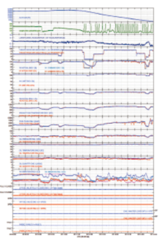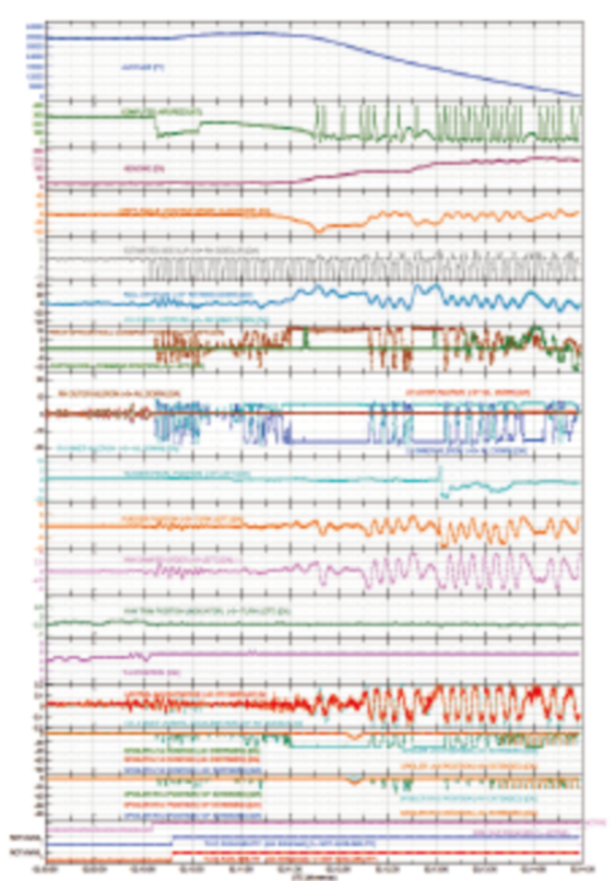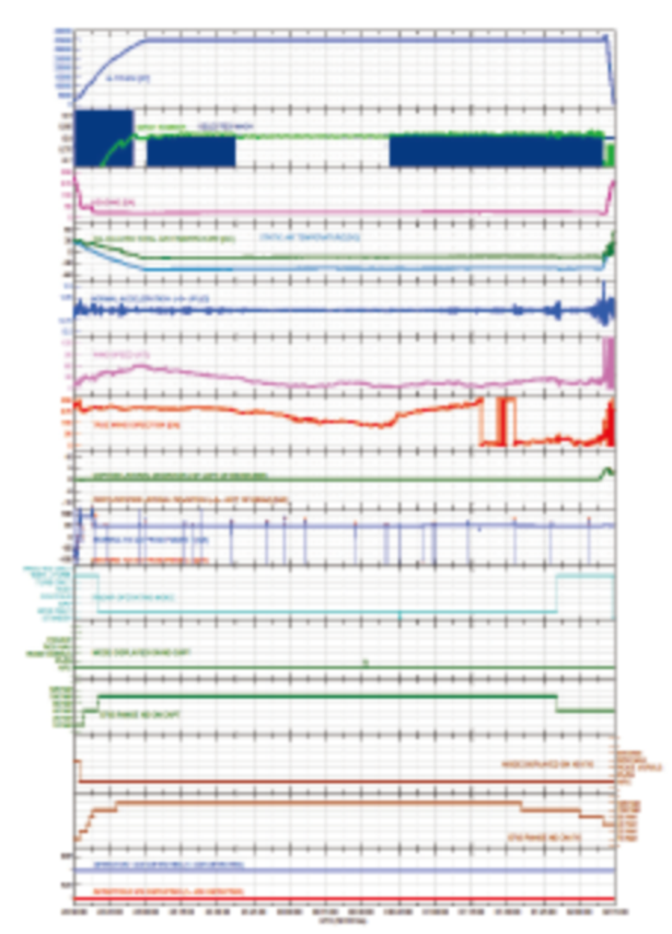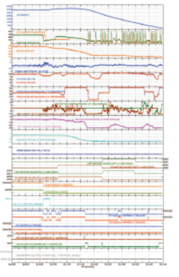 | •Theco-pilotsidestickispositionedalternativelyleftat 3/4tothestoppositionthenrighttothehalf-travelpositionwithmostlyleftinputs. •TheCaptainsidestickispositioned: -leftat¾tothestoppositionthenrighthalfwaytothestopthenleftagainat¾tothestopposition -alternativelynose-upandnose-down(between4°nose- upand3°nose-down) -atneutralfrom2h13min24. •Therollanglefluctuatesbetween17°rightand10°left.(periodof7seconds) •TheDUALINPUTparameterisactivatedtwice. |