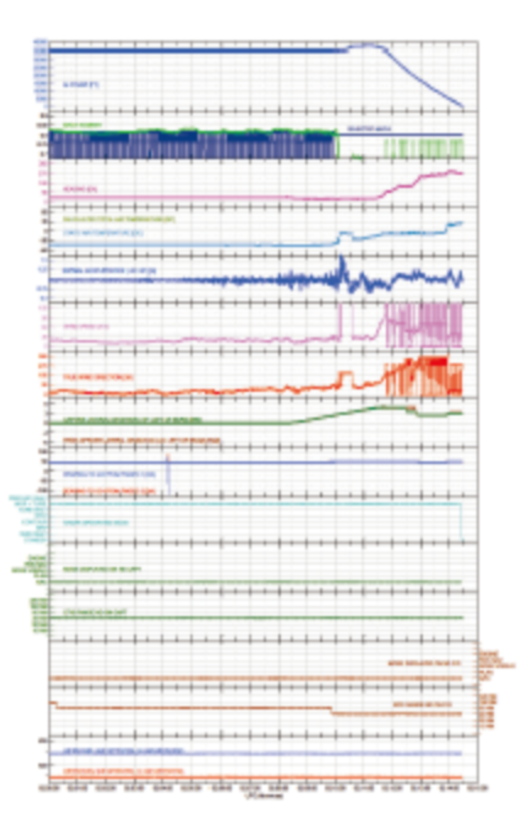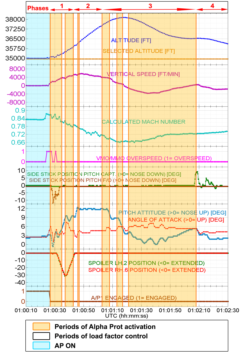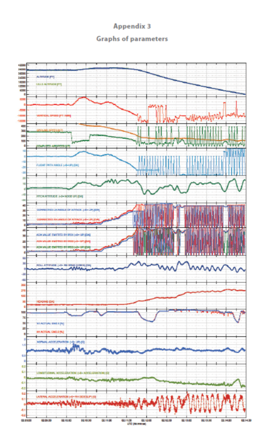 | •Theco-pilotsidestickispositionednose-uponaverageatthehalf-travelposition.From2h13min36,theco-pilotsidestickispositionednose-upinstopposition. •Thepitchattitudechangesfrom6°nose-downto13°nose-upin11secondsthenstabilisesatabout11°nose-up. •TheCASbecomesinvalid(NCDstatus). •TheISISCASbecomesinvalid(FWstatus). •Theanglesofattackbecomeinvalid(NCDstatus). |