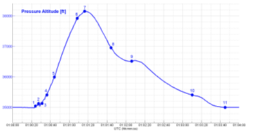 在飞机达到最大高度前PF将注意力回到飞行仪表上并保持了大约10秒。他之后强调飞机高度38000英尺。大约30秒后他意识到AP已经断开。