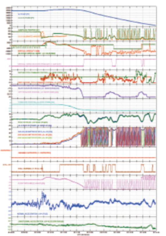 | •TheCaptainsidestickispositionednose-upbetweentheneutralandstopposition. •Theco-pilotsidestickisatneutraluntil2h14min17,thennose-upinstopposition. •Thepitchattitudechangesfrom15°to18°nose-upthendecreasesto3.5°nose-downbeforeincreasingagainto 16°nose-up. •At2h14min19,theCASisnolongerNCD.Itchangesfrom30ktto60ktthendecreasesto32kt. •At2h14min21,theangleofattack2isnolongerNCDforonesecondandis41.1°.Thestallwarningistriggered. •TheCaptainsidestickispositionedalternativelytotherightthenleftwithmainlyrightinputs. •Theco-pilotsidestickisatneutraluntil2h14min18thenpositionedlefttothehalf-travelposition. •Therollanglefluctuatesbetween9°rightand18°left. |