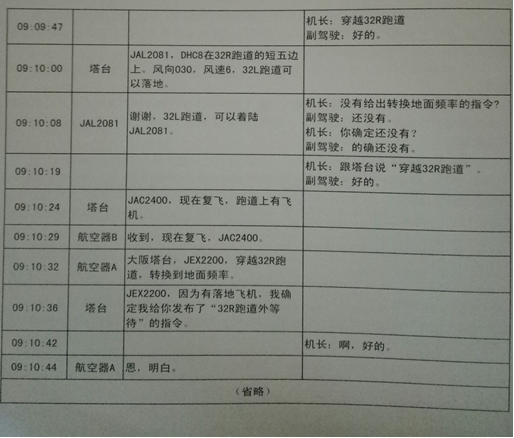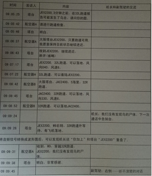 09:09: 31航空器A回答“收到,W9,穿过32R跑道,JEX2200”并用日语说“我没有发现跑道上有鸟的尸体”。