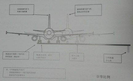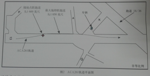 右主轮轮眙的杀车痕迹说明接地后飞机继续向跑道左侧滑行约350英尺,然后向跑道中心线方向修正滑行约350英尺。大约在接地点350英尺处,右主轮距跑道中心线的最远距离约83英尺,左主轮距跑道中心线的距离为108英尺,跑道外8英尺。左主轮撞碎2个跑道边灯。
