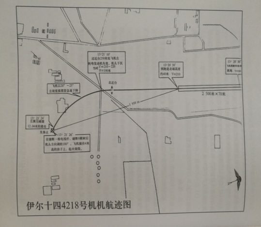 1988107日,4218号机由机长×××、正驾驶×××驾驶,于13:20从空军临汾机场由南向北起飞,滑跑约900米离地转入正常上升,飞越近距导航台(距跑道北头1000米)上空后,向左转弯,突然机头向下一沉,高度下降,接着飞机摇摆着向下坠。左机翼擦过临汾地区福利工厂一座高12米的楼房房顶,左大翼变形,左大翼前缘防冰加温管处与大翼分离,成“U”字型坠落在地面上,接着飞机将1根水泥电线杆和8棵杨树撞断,左发螺旋桨将直径21厘米和13厘米的2棵杨树砍断,桨轴从封严环前折断,螺旋桨坠落在公路上,桨叶无卷曲,桨帽朝地,砸坑深度为28厘米,土坑直径与奖帽吻合,飞机越过公路,机头方向与原航迹倒转180度,撞在路西一家饭店屋顶上,飞机左翼撞楼点距坠落点46.70米,失事地点在跑道北端真方位71 950米处,飞机从起飞滑跑至坠地失事约一分半钟。