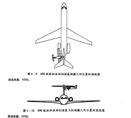 相撞发生时,498航班正向西北方向下降通过6560英尺,同时派珀切诺基飞机正在向东飞行。根据撞击对DC9的损伤,判断当时派珀切诺基飞机的发动机撞到了DC9飞机水平安定面的主支撑结构,如图4 -9所示。碰撞削掉了切诺基飞机的舱顶,也导致DC9的水平安定面与机身分离,如图410所示。