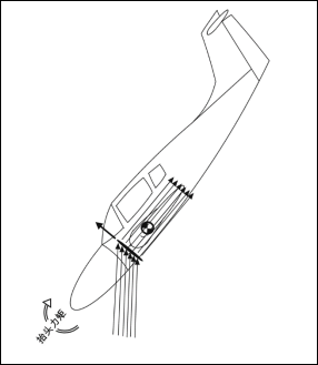 如图2-9所示,飞机在大迎角时,流经螺旋桨旋转面的空气流被折向下方,对螺旋桨产生向上的反作用力,这个力对于螺旋桨前置(螺旋桨位于飞机重心前面)飞机的重心来说,是抬头力矩,因此增加发动机功率将增加飞机姿态,反之减小发动机功率会减小飞机姿态。这就是大多数飞机螺旋改出第一个动作要求收光油门的原因。