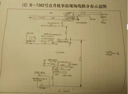 失事现场残骸散落在6 5×16米范围内,该机先刮断一片12米长的小树梢,然后旋翼打断多棵10厘米粗细的小树,机头撞在石头起火烧毁。发动机、水平安定面和尾桨沿4 5度坡度向上翻滚,散落在距撞击点后53米处,发动机连体、水平安定面、尾桨完整。各主要部件、系统、设备的情况如下。