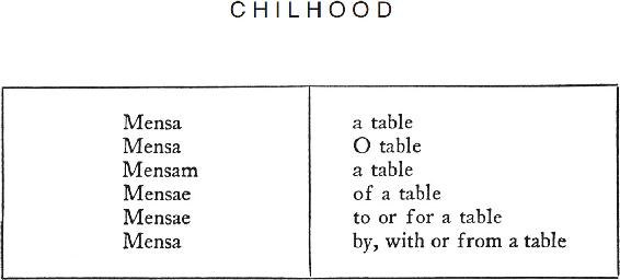 他打开书,翻开一页,指着一份表格里的字,对我说:“这是拉丁语语法,你必须掌握。给你半个小时的时间,到时候我会看看你掌握了哪些。”说完,他就走了。