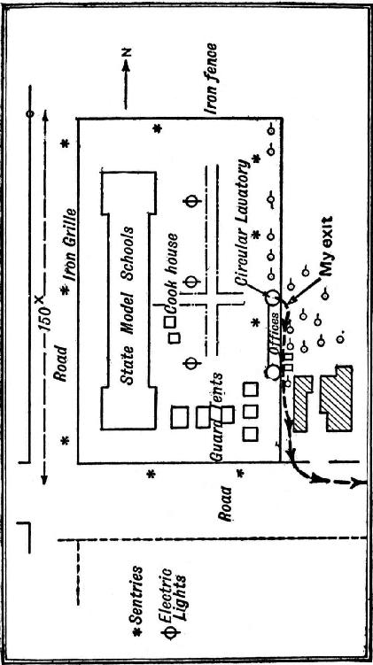 国立示范学校在一个宽敞的四方形院子里。这个四方形院落的其中两面院墙是波纹马口铁栅栏,大概十英尺高,另外两边院墙则是铁丝网。对于年轻人而言,这些栅栏不足为惧。然而,院子里每隔50码就有哨兵负责监视,他们不仅腰间配备着手枪,手里还端着步枪。这样一来,这些栅栏就成了一道活墙,看上去比任何障碍都难以逾越。