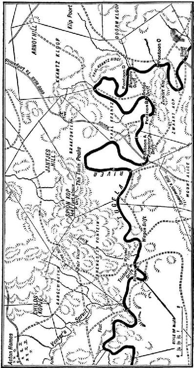 随后,布勒率领部队沿着斯皮扬山东侧的山岭行进,抵达多恩峡谷。部队兵力得到增强,包括几门海军远程大炮在内,我们的大炮增至100门。这几门远程大炮威力强大,能发射50镑重炮弹。在这里,我将简要叙述周密的作战计划。按照计划,一个步兵旅将借助于炮火的掩护进攻布尔军的心脏,因此,我们提前在波希特搭建了一座桥。等到把敌人所有的注意力都吸引过来之后,其他三个旅去距离这里2英里的下游再搭建一座桥。两个旅对多恩峡谷展开攻击,另一个旅对左侧的瓦尔格兰茨山岭展开攻击。到那个时候,一个骑兵炮兵连,再加上我所在的骑兵旅和正规军骑兵旅,将会从这些外围队伍打通的通道冲向克利普山口。直到行动的前一晚,我们才得知这些严格保密的行动计划,未免忧心忡忡。在斯皮扬山顶,我们从望远镜中发现这附近遍布细小的支流和低矮的山丘,还有很多庞大的石块和浓密的灌木丛。我们预估,敌人一定会誓死抵抗冲锋的骑兵。