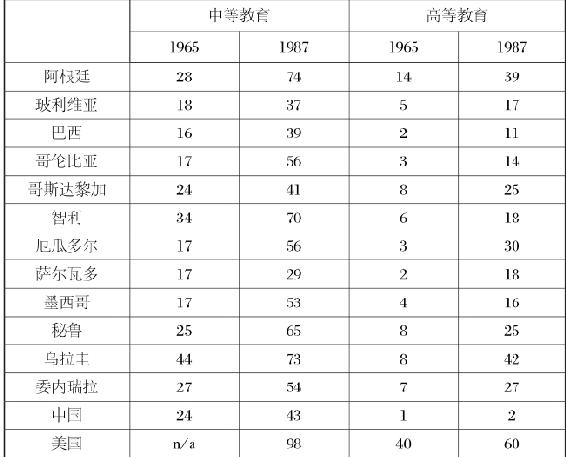表4说明中等教育入学人数增加了,但适龄人口的相当一部分仍没有接受中等教育。在拉美,中产阶级与上层阶级可以通过私立大学预科和中等教育享有进入私立大学的特殊待遇。但在像墨西哥和秘鲁这样的国家,国立大学的增长与中等教育的普及是并行的。